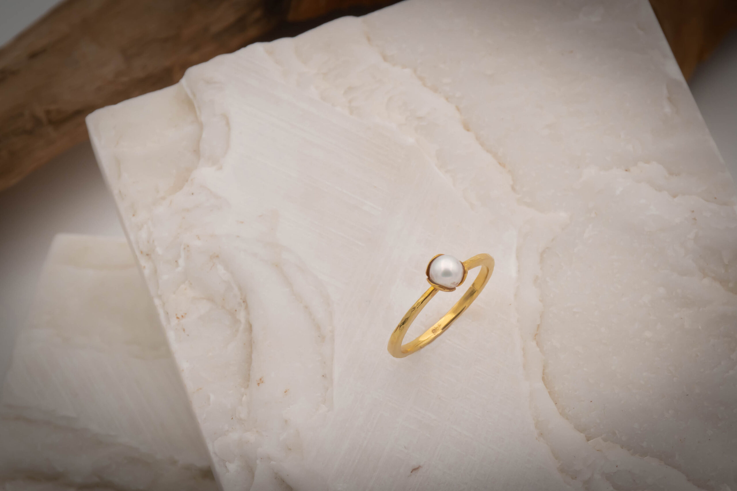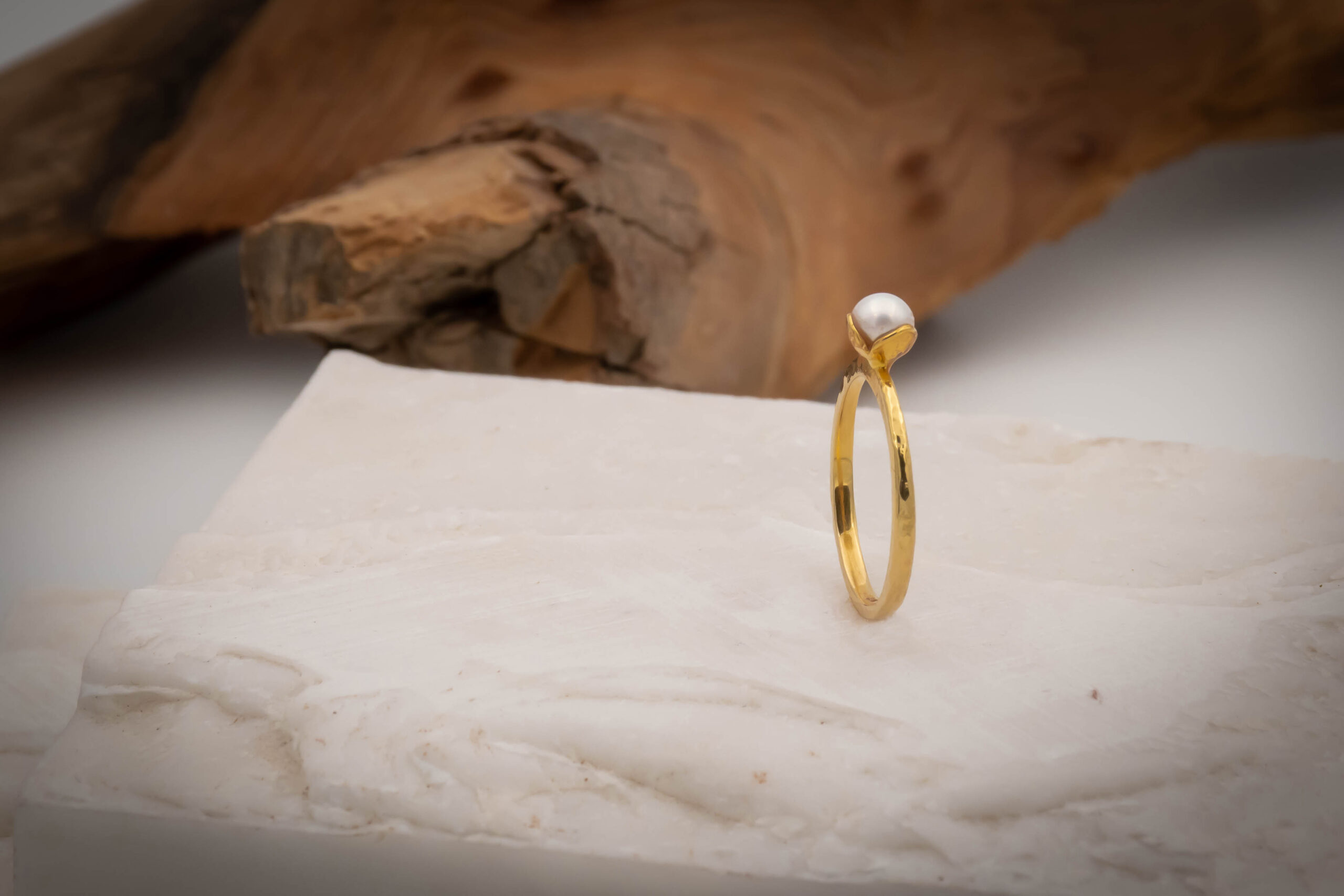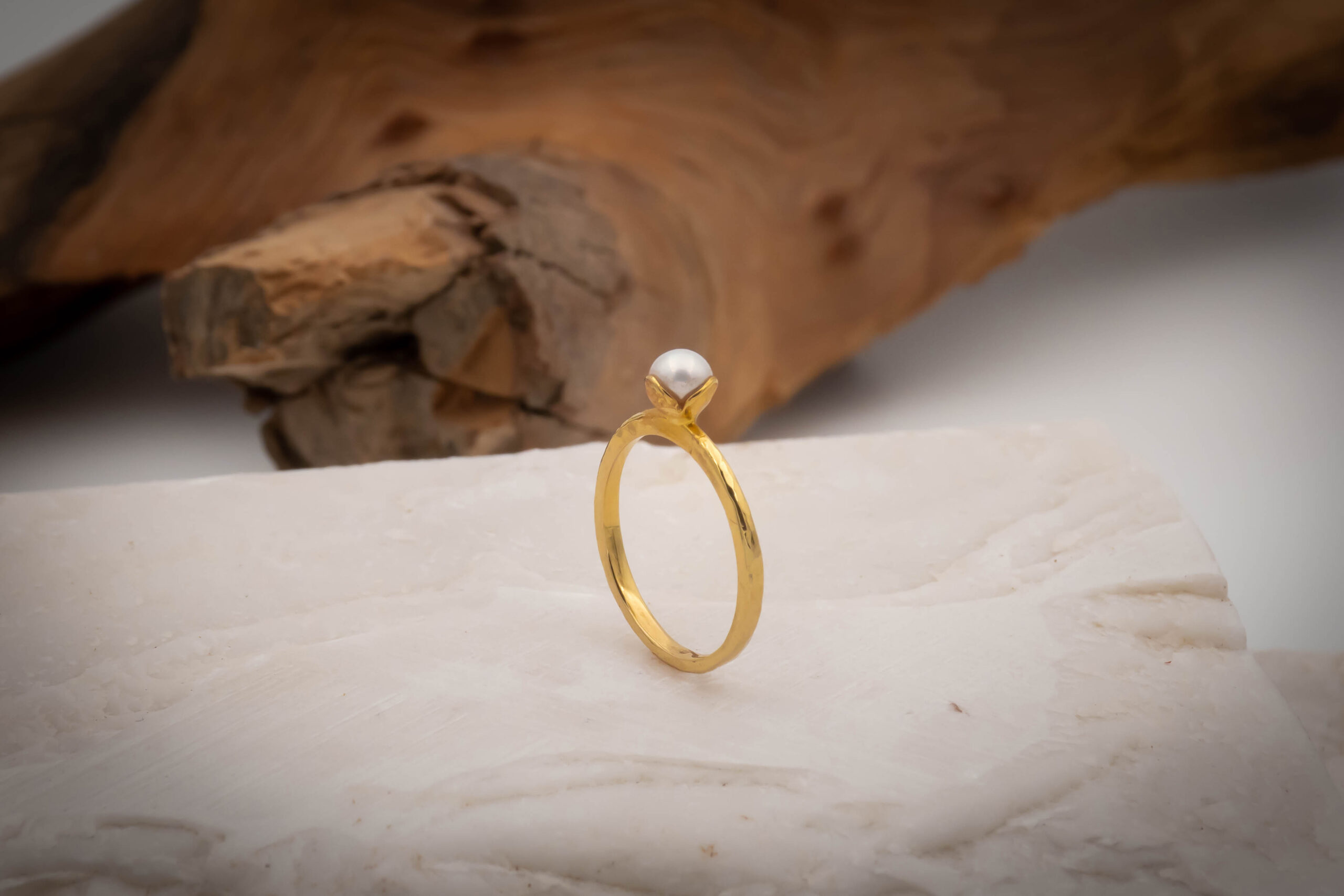 Δαχτυλίδι με μαργαριτάρι με βάση από μοτίφ λουλουδιού, με σφυρήλατη γάμπα σε χρυσό Κ 14.